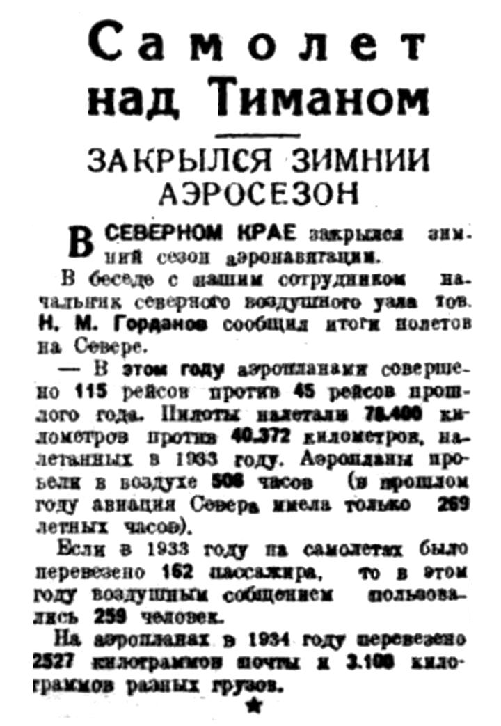 Если в 1933 году на самолетах было перевезено 162 пассажира, то в этом году воздушным сообщением воспользовались 259 человек.