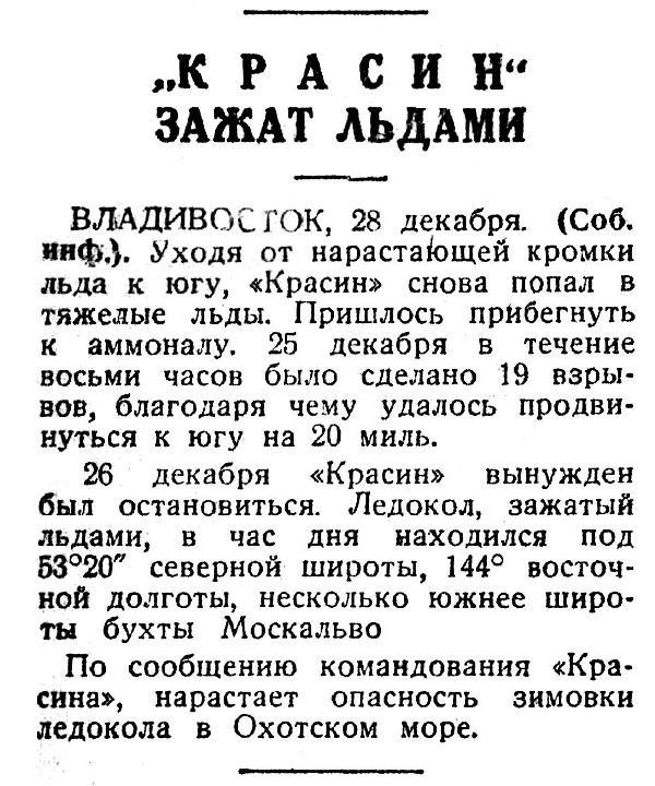 26 декабря «Красин» вынужден был остановиться. Ледокол, зажатый льдами, в час дня находился под 53°20" северной широты, 144° восточ­ной долготы, несколько южнее широ­ты бухты Москальво. По сообщению командования «Кра­сина», нарастает опасность зимовки ледокола в Охотском море.