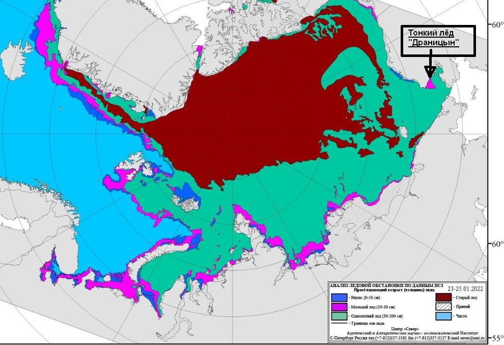 Если судить по карте ледовойобстановки, то "Драницын"находится на краюучастка молодого тонкого льда у мыса Хоуп (Головнина).
