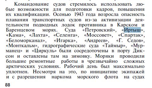 ... Осенью 1943 года возросла опасность плавания транспортных судов из-за активизации деятельности подводных лодок противника в Карском и Баренцевом морях. Суда «Петровский», «Иртыш», «Кама», «Лахта», «Селенга», «Моссовет», «Спартак», «Беломорканал», «Игарка», «Андреев», «Г. Седов», «Монткальм», гидрографические суда «Таймыр», «Мурманец» и «Циркуль» были сосредоточены в порту Диксон и оставлены там на зимовку.