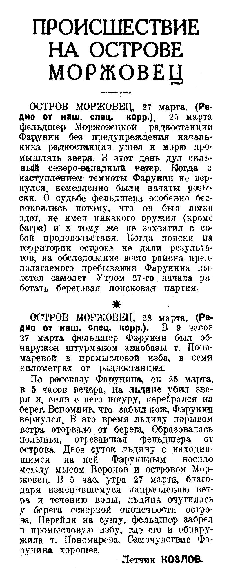 ОСТРОВ МОРЖОВЕЦ, 27 марта. (Радио от наш. спец. корр.). 25 марта фельдшер Моржовецкой радиостанции Фарунин без предупреждения начальника радиостанции ушел к морю промышлять зверя. В этот день дул сильный северо-западный ветер. Когда с наступлением темноты Фарунин не вернулся. немедленно были начаты розыски. О судьбе фельдшера особенно беспокоились потому, что он был легко одет, не имел никакого оружия (кроме багра) и к тому же не захватил с собой продовольствия. Когда поиски на территории острова не дали результатов, на обследование всего района предполагаемого пребывания Фарунина вылетел самолет. Утром 27-го начала работать береговая поисковая партия.