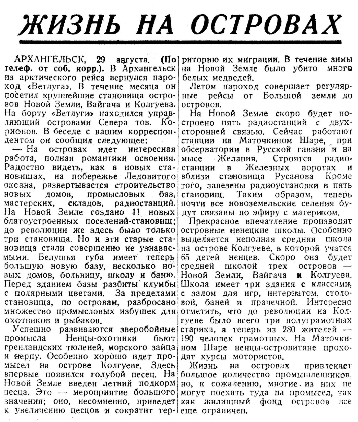 — На островах идет интересная работа, полная романтики освоения. Радостно видеть, как в новых становищах, на побережье Ледовитого океана, развертывается строительства новых домов, промысловых баз, мастерских, складов, радиостанций. На Новой Земле создано 11 новых благоустроенных поселений-становищ; до революции же здесь было только три становища. Но и эти старые становища стали совершенно не узнаваемыми. Белушья губа имеет теперь большую новую базу, несколько новых домов, больницу, школу и баню. Перед зданием базы разбиты клумбы с полярными цветами. За пределами становища, по островам, разбросано множество промысловых избушек для охотников и рыбаков.