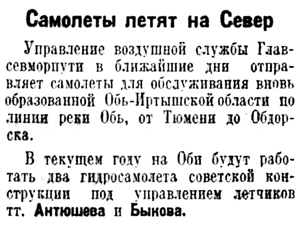 В текущем году на Оби будут работать два гидросамолета советской конструкции под управлением летчиков тт. Антюшева и Быкова.