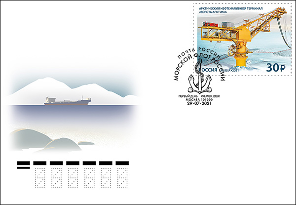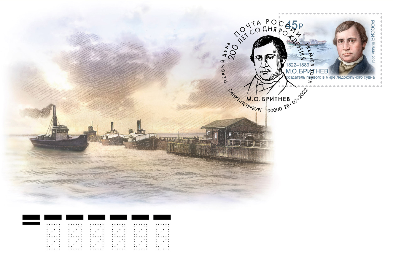 На марке изображены портрет М.О. Бритнева и ледокольное судно «Пайлот».