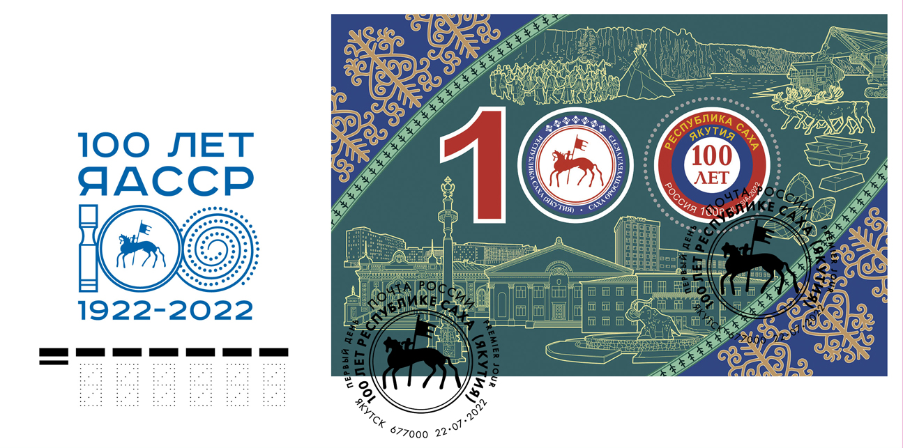 На почтовой марке надпись «Республика Саха (Якутия). 100 лет»; на полях почтового блока - герб Республики Саха (Якутия), национальный орнамент, якутский хоровод, Государственный академический русский драматический театр им. А.С. Пушкина, Музей истории изучения вечной мерзлоты, Национальный художественный музей Республики Саха (Якутия), Ленские столбы, якутское предприятие по торговле алмазами «АЛРОСА», памятник основателю Якутска Петру Бекетову и т. д.