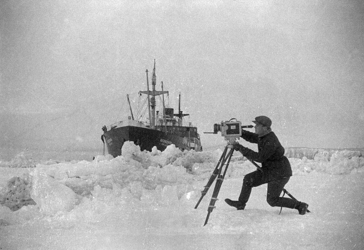 Снимает кинооператор Аркадий Шафран. «Челюскин». 1933 г. Автор фото: М.А.Трояновский.