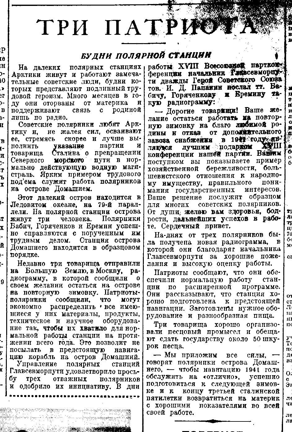 Три патриота .Будни полярной станции//Вечерняя Москва (№54)5 марта 1941