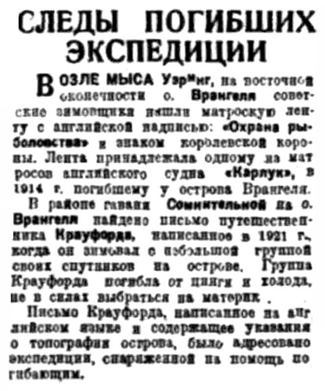 Недавно во Владивостоке был интересный случай С американскими эскимосами, захваченными за хищнической охотой на принадлежащем нам острове Врангеля. Эти эскимосы, конечно, оказались без заграничных паспортов, так как американское правительство, видите-ли, полагало, что Советской России не до острова Врангеля и под шумок его можно признавать американским. Но на остров Врангеля пришел советский корабль и не считаясь с формальностями, конеч-