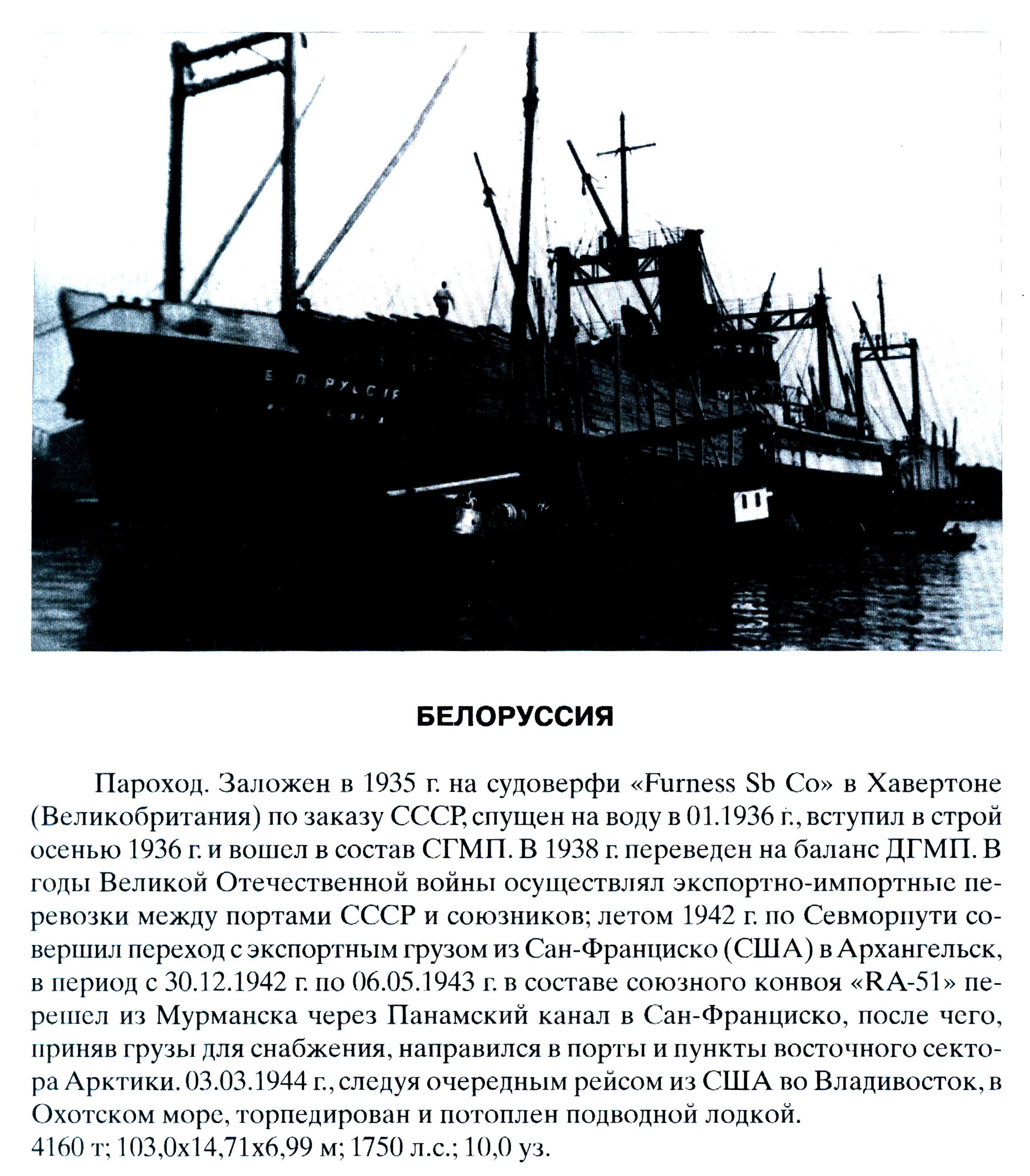 Пароход. Заложен в 1935 г. на судоверфи «Furness Sb Со» в Хавертоне (Великобритания) по заказу СССР, спущен на воду в 01. 1936 г., вступил в строй осенью 1936 г. и вошел в состав СГМП. В 1938 г. переведен на баланс ДГМП. В годы Великой Отечественной войны осуществлял экспортно-импортные перевозки между портами СССР и союзников; летом 1942 г. по Севморпути совершил переход с экспортным грузом из Сан-Франциско (СШ А) в Архангельск, в период с 30. 12. 1942 г. по 06. 05. 1943 г. в составе союзного конвоя «RA-51» перешел из Мурманска через Панамский канал в Сан-Франциско, после чего, приняв грузы для снабжения, направился в порты и пункты восточного сектора Арктики. 03. 03. 1944 г., следуя очередным рейсом из США во Владивосток, в Охотском море, торпедирован и потоплен подводной лодкой.