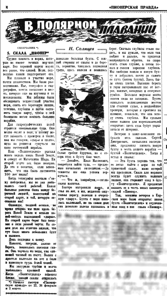 Солнцев Н.В полярном плавании//Пионерская правда №№ 26,28,30,31 1937 г.