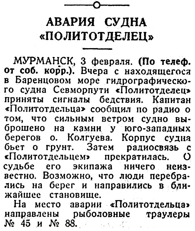 АВАРИЯ СУДНА «ПОЛИТОТДЕЛЕЦ»