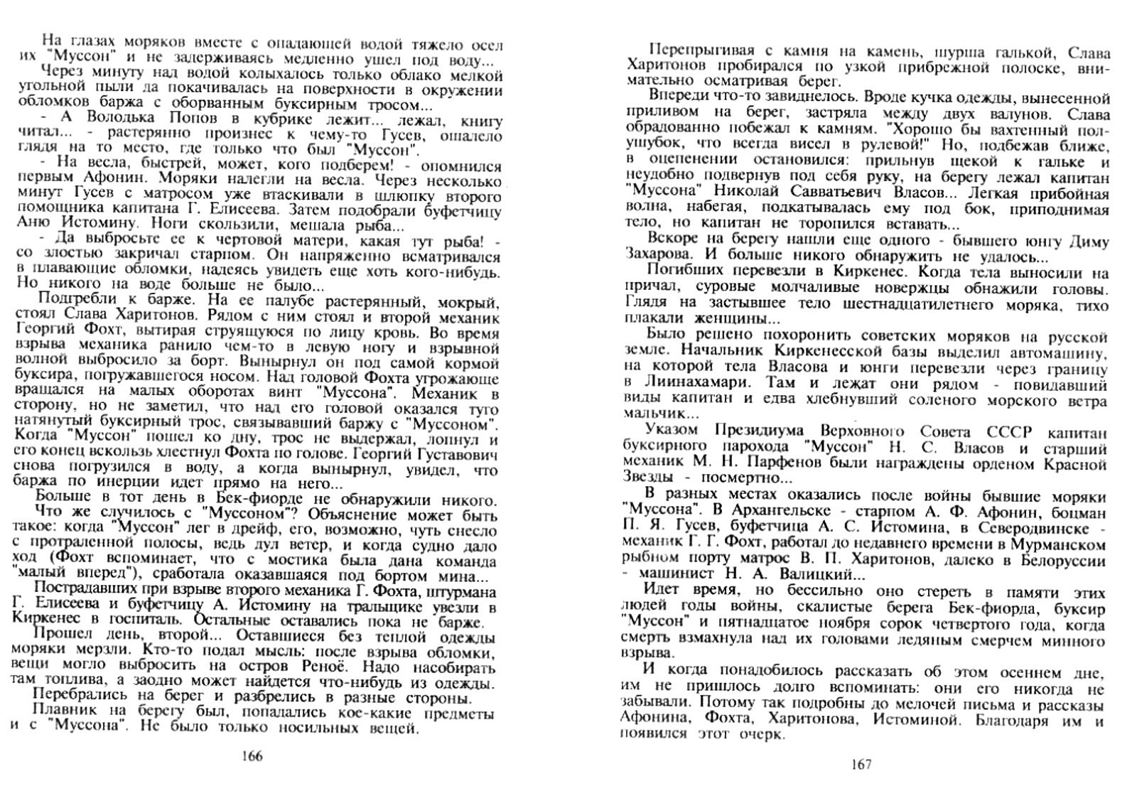Указом Президиума Верховного Совета СССР капитан буксирного парохода "Муссон" Н. С. Власов и старший механик М. П. Парфенов были награждены орденом Красной Звезды - посмертно...