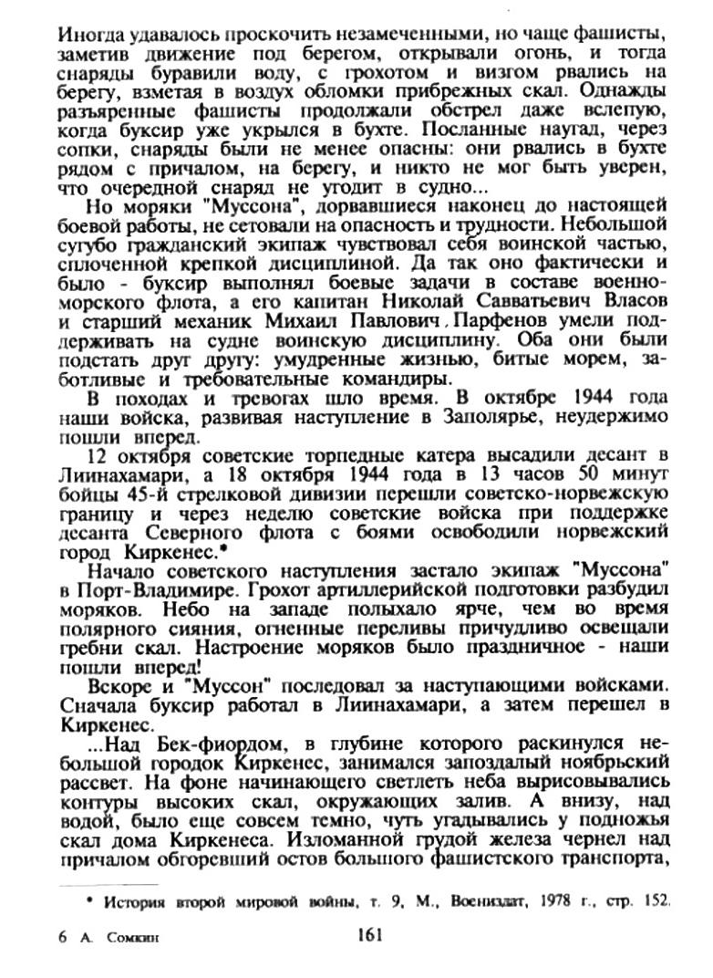 Впервые вышел я в морское плавание в навигацию 1942 года на п/х "Лахта" Северного морского пароходства, когда мне еще не исполнилось шестнадцати лет. На смену взрослым кадровым морякам, уходящим на фронт, тогда приходила зеленая молодежь, прибывавшая со всех концов нашей страны. Мне же, архангельскому пареньку, само собой уготована была морская судьба. Трудными и опасными были плавания в те годы, но нас, молодых ребят, это не пугало. Мне и моим товарищам военных лет, кого из них я помню, страстно хотелось найти свое место и вносить посильный вклад в защиту Родины. Пусть не покажутся выспренными эти слова, это было именно так. Я не знал никого из моих сверстников по учебе в школе, в морском техникуме или среди своих дворовых ребят, кто думал бы иначе. Белое и Баренцево море, где проходили наши каботажные плавания, были доступны для вражеских подводных лодок и авиации, и мы всегда были готовы к встрече с опасностями, а без них обходилось редкое плавание. Иногда они заканчивались трагически. В вестибюле управления Северного морского пароходства имеется памятная доска, где перечислены суда, погибшие в период войны, и пофамильно названы имена погибших на них моряков. Есть на этой доске и буксирный пароход "Муссон" и девять членов его экипажа. И когда я прочитал эти строки, передо мной ожили в воспоминаниях мои товарищи, многие из которых разделили судьбу этого небольшого суденышка и вместе с ним погребены в водах Баренцева моря. И мне захотелось поделиться своими воспоминаниями и отдать дань памяти тем, кто погиб на боевом посту, если учесть, что наше судно входило в состав вспомогательных судов Северного флота под номером М-39, имело вооружение и на гафеле несло военно-морской флаг. Всю навигацию 1943 года я проплавал на пароходе "Канин", а в декабре, после передачи судна в Севгосрыбтрест, меня направили матросом на буксирный пароход "Муссон". Отправляясь на Экономию, я никак не предполагал, что буду участвовать в подъеме затонувшего судна, что придется мне жить не в теплой каюте, а в холодном бараке лесозавода № 26, а вместо матросской вахты справляться с почти пудовой пешней, окалывая лед вокруг судна, от которого над водой торчали только мачта, труба и часть верхнего мостика. Как мне помнится, работали все одинаково, без различия на комсостав или рядовой. Небольшой и, как я сразу почувствовал, дружный экипаж правильно понимал задачу-судно должно быть готово к подъему До наступления ледохода. Мы кололи лед, очищали майну от льда, заводили стальные тросы, вокруг корпуса судна и с помощью ручных лебедок поставили судно на ровный киль. Много было вложено труда, тросы рвались, судно снова заваливалось в первоначальное положение, все начинали сначала. Светлого времени было мало, затемно после трехкилометровой ходьбы приступали к работам и с темнотой уходили в барак, где совмещали скудный обед с таким же ужином. Организатором и зачинателем всех работ был наш старпом Андрей Федорович Афонин. Он не чурался никакой работы и был для нас примером в отношении к труду. Нельзя было стоять в стороне, видя, как он трудится, орудует топором или пешней. Небольшого роста, в полушубке, с красным от мороза лицом, он заражал всех трудовым энтузиазмом, и каждый день у нас не проходил даром. Вместе с нами трудился и второй штурман Елисеев, по оплошности которого осенью за