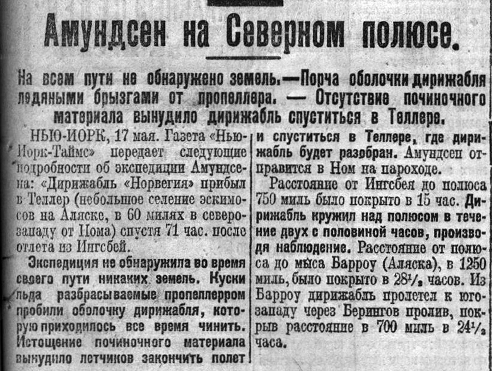 НЫО-ИОРК, 17 мая. Газета «Нью-Иорк-Таймс» передает следующие подробности об экспедиции Амундсена: «Дирижабль "Норвегия" прибыл в Теллер (небольшое селение эскимосов на Аляске, в 60 милях в северо-западу от Нома) спустя 71 час. после отлета из Ингсбей.