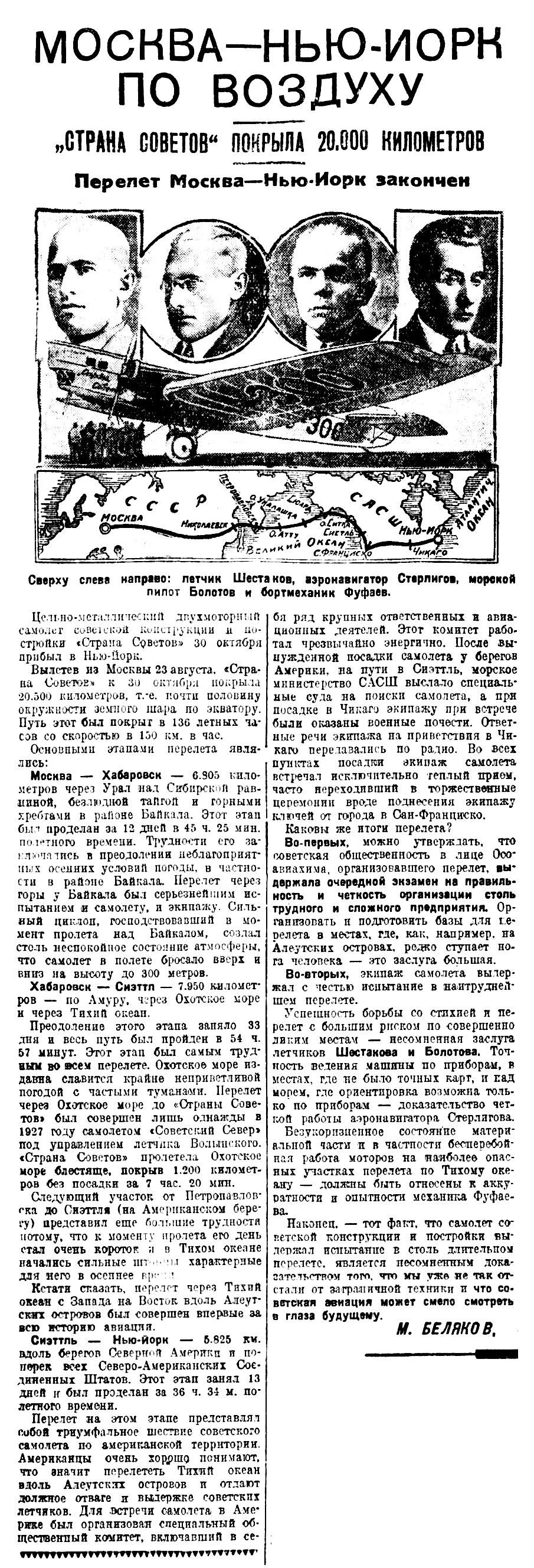 И пусть — третьего дня «люди-птицы» прибыли на Советскую землю поездом, а самолет придет к нам морем, — недалек тот час, когда советское знамя будет реять над самолетом, который сделал перелет Москва — Нью-Йорк — Москва.