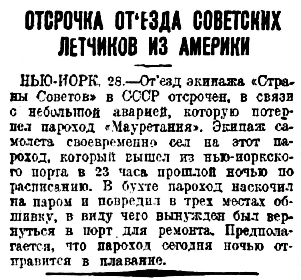 НЬЮ-ЙОРК, 28. — Отъезд экипажа «Страны Советов» в СССР отсрочен, в связи с небольшой аварией, которую потерпел пароход «Ма[у]вр[е]итания». Экипаж самолета своевременно сел на этот пароход, который вышел из нью-йоркского порта в 23 часа прошлой ночью по расписанию. В бухте пароход наскочил на паром и повредил в трех местах обшивку, в виду чего вынужден был вернуться в порт для ремонта. Предполагается, что пароход сегодня ночью отправится в плавание.
