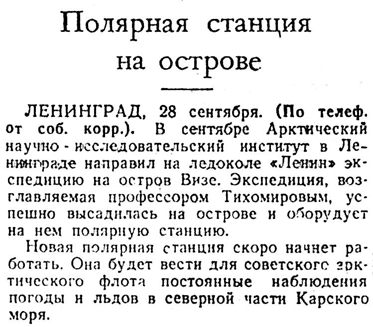 На острове Визе в северной части Карского моря в этом году организуется полярная станция Арктического института. Начальником ее назначен геофизик Ф. И. Ескин. Для станции отправлены жилой дом, оборудование, запасы продовольствия. Научные работники пробудут на острове два года и будут вести наблюдения за состоянием атмосферы и моря.