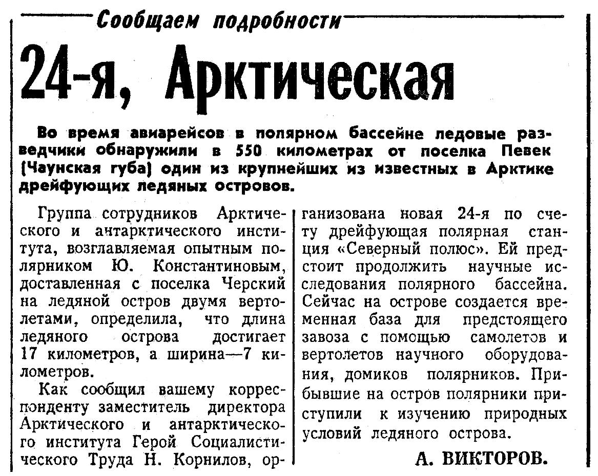 Как сообщил вашему корреспонденту заместитель директора Арктического и антарктического института Герой Социалистического Труда Н. Корнилов, организована новая 24-я по счету дрейфующая полярная станция «Северный полюс». Ей предстоит продолжить научные исследования полярного бассейна. Сейчас на острове создается временная база для предстоящего завоза с помощью самолетов и вертолетов научного оборудования, домиков полярников. Прибывшие на остров полярники приступили к изучению природных условий ледяного острова.