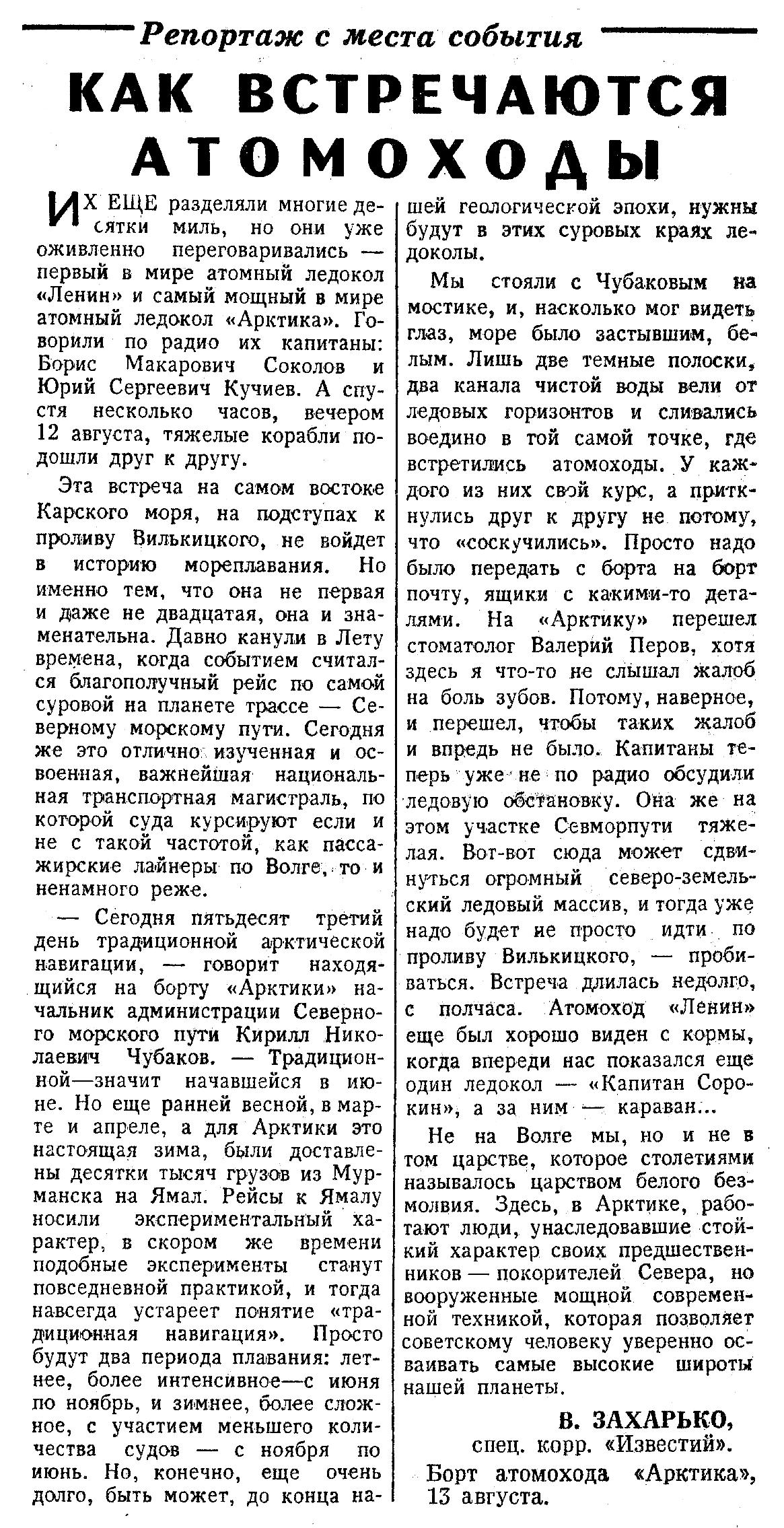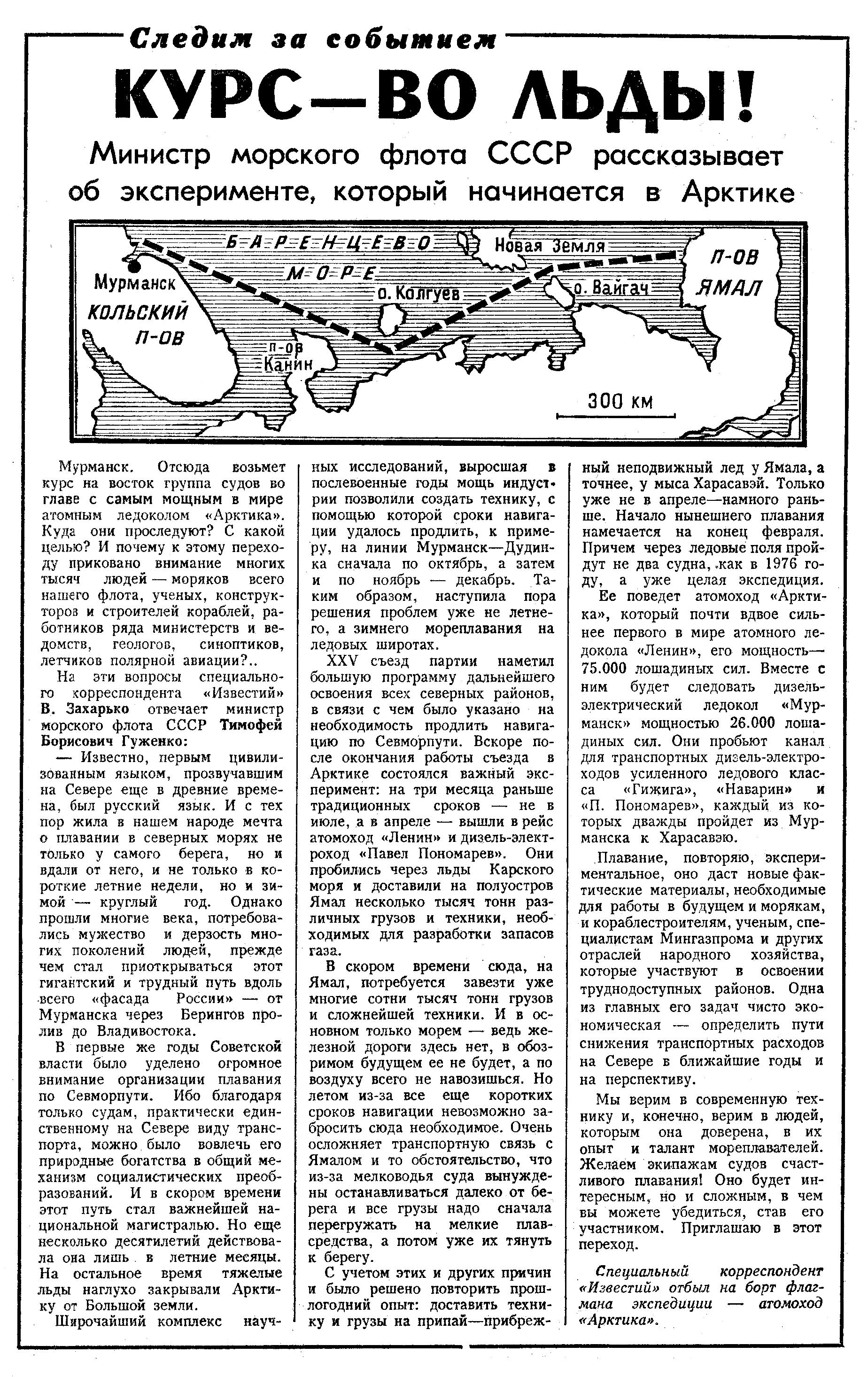 Как сообщали «Известия», 28 февраля вышла из Мурманска и взяла курс на восток группа судов во главе с самым сильным в мире атомным ледоколом «Арктика» (75.000 лошадиных сил). Перед экспедицией была поставлена задача большого народнохозяйственного значения и исключительной сложности: в самое суровое время года на три месяца раньше традиционных сроков навигации пройти через сплошные льды Карского моря и доставить строительные материалы, технику, топливо, другие грузы на полуостров Ямал, где сейчас идет подготовка к освоению газовых месторождений.