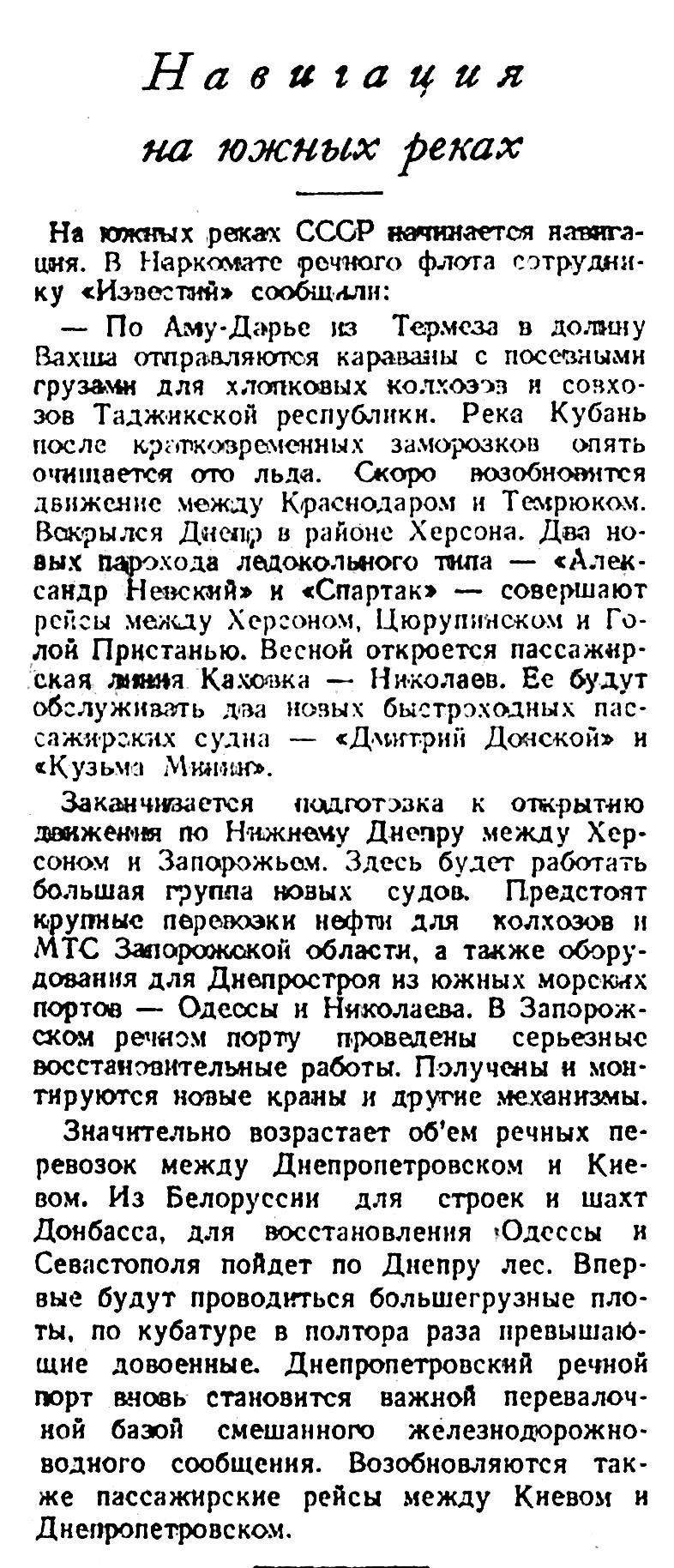 — По Аму-Дарье из Термеза в долину Вахша отправляются караваны с посевными грузами для хлопковых колхозов и совхозов Таджикской республики. Река Кубань после кратковременных заморозков опять очищается ото льда. Скоро возобновится движение между Краснодаром и Темрюком. Вскрылся Днепр в районе Херсона. Два новых парохода ледокольного типа — «Александр Невский» и «Спартак» — совершают рейсы между Херсоном, Цюрупинском и Голой Пристанью. Весной откроется пассажирская линяя Каховка — Николаев. Ее будут обслуживать два новых быстроходных пассажирских судна — «Дмитрий Донской» и «Кузьма Минин».