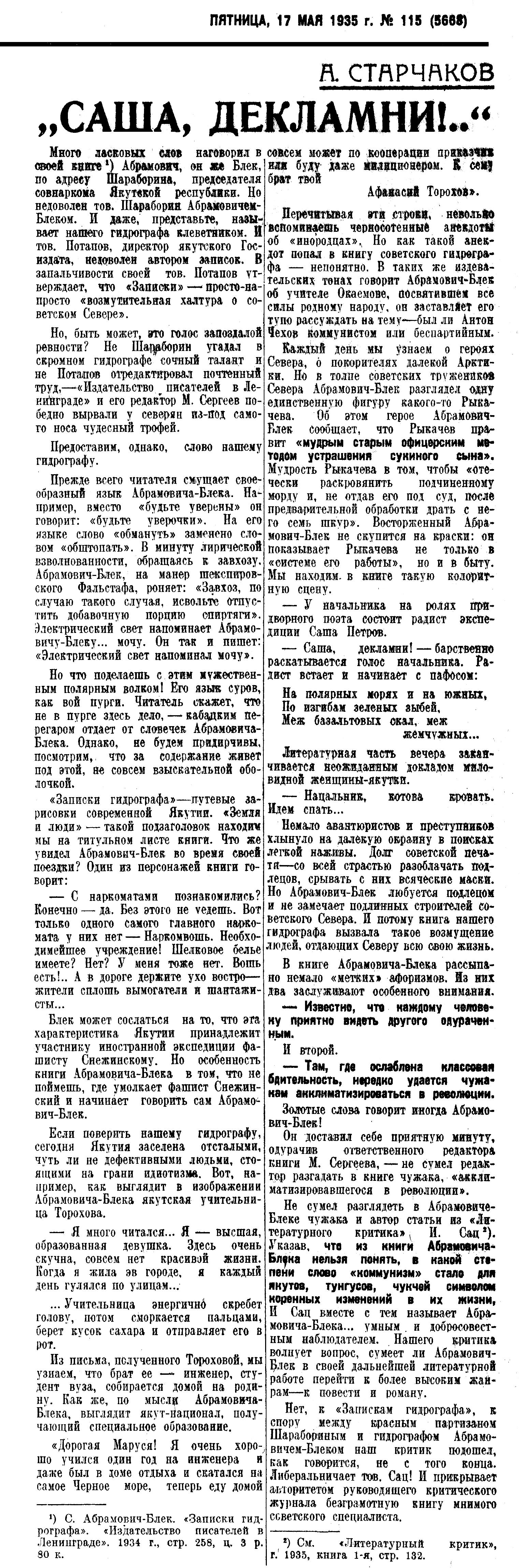 Много ласковых слов наговорил в своей книге 1) Абрамович, он же Блек, по адресу Шараборина, председателя совнаркома Якутской республики. Но недоволен тов. Шараборян Абрамовичем-Блеком. И даже, представьте, называет нашего гидрографа клеветником. И тов. Потапов, директор якутского Госиздата, недоволен автором записок. В запальчивости своей тов. Потапов утверждает, что «Записки» — просто-напросто «возмутительная халтура о советском Севере».