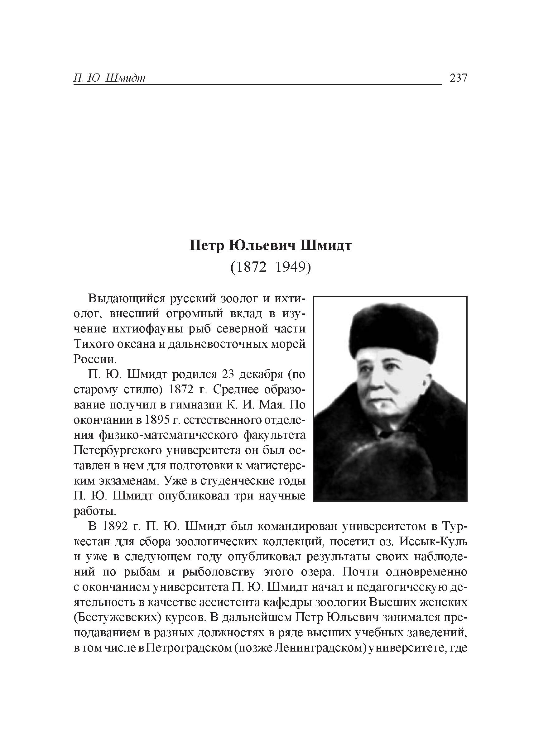Среди плеяды исследователей Северной Пацифики особое место, несомненно, занимает выдающийся отечественный зоолог, биогеограф и ихтиолог Петр Юльевич Шмидт, внесший огромный вклад в изучение фауны рыб северной части Тихого океана и дальневосточных морей России. Недаром один из российских миллионеров и организаторов экспедиции по исследованию Камчатки Федор Павлович Рябушинский в ноябре 1907 г. обратился именно к нему с предложением взять на себя руководство Зоологическим отделом этой экспедиции, в задачи которого входило многостороннее изучение фауны полуострова.