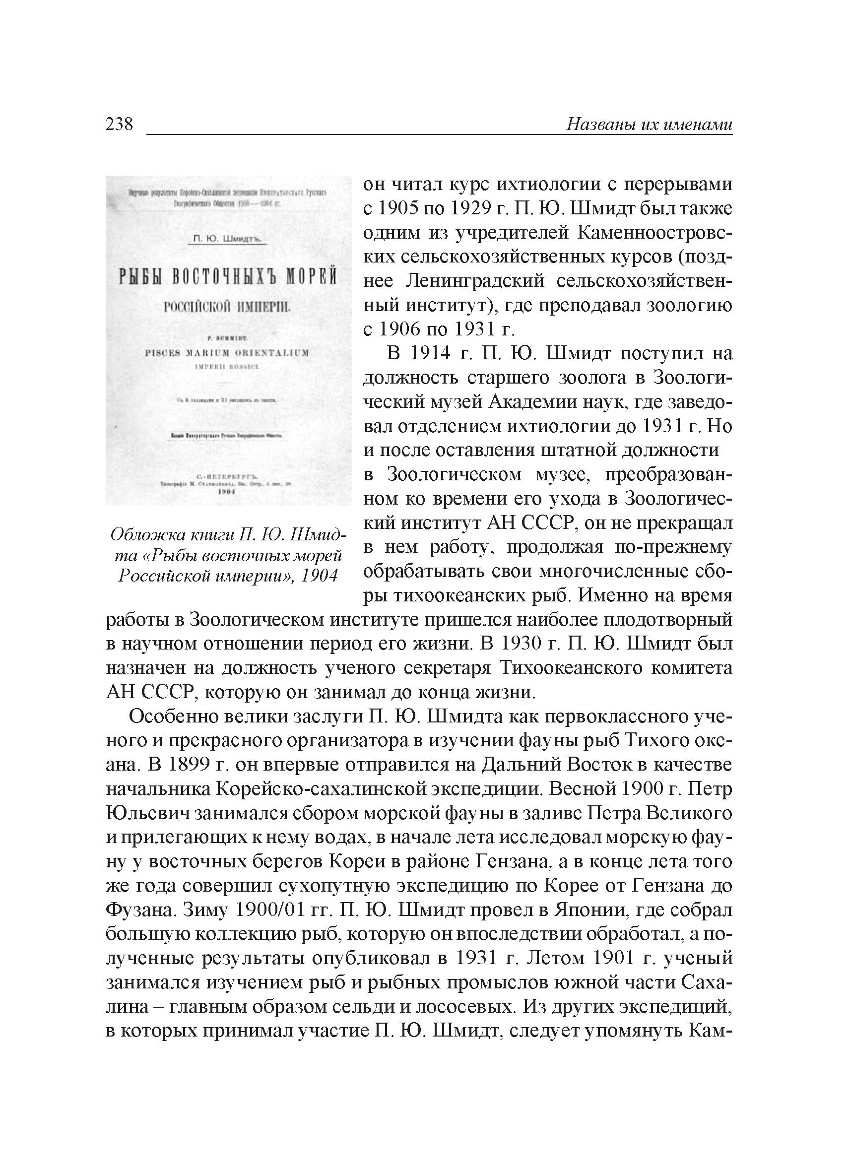 В 1899 г. П. Ю. Шмидт впервые отправился на Дальний Восток в качестве начальника Корейско-сахалинской экспедиции. Весной 1900 г. Петр Юльевич занимался сбором морской фауны в заливе Петра Великого и прилегающих к нему водах, в начале лета исследовал морскую фауну у восточных берегов Кореи в районе Гензана, а в конце лета того же года совершил сухопутную экспедицию по Корее от Гензана до Фузана. Зиму 1900/1901 гг. П. Ю. Шмидт провел в Японии, где собрал большую коллекцию рыб, которую он впоследствии обработал и опубликовал в 1931 г. Летом 1901 г. ученый занимался изучением рыб и рыбных промыслов южной части Сахалина - главным образом сельди и лососевых (1, 2). Из других экспедиций этого периода следует особо отметить Камчатскую экспедицию Императорского Русского географического общества (ИРГО), снаряженную на средства Ф. П. Рябу-шинского, в которой П. Ю. Шмидт в 1908-1909 гг. руководил работами Зоологического отдела (3).