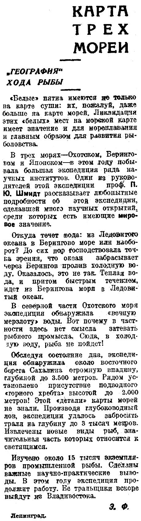 Физический закон о том, что всякое тело, погруженное в воду, теряет в весе столько, сколько весит вытесненная им жидкость, или математическая теорема о том, что квадрат, построенный на гипотенузе, равен сумме квадратов двух катетов, конечно, великие открытия, но они сделаны уже много веков назад. И если бы современный ученый выступил с горделивым заявлением, что он открыл закон Архимеда, мы сказали бы, что место ему не среди бессмертных, а на ученической скамье. В «Последних Новостях» от 21 марта помещена перепечатка из «Вечерней Москвы», под названием «Открытие проф. Шмидта». Из этой заметки советской газеты мы узнаем, что проф. П. Шмидт, производя обследование Охотского, Берингова и Японского морей, сделал, как будто бы, великое открытие. Он обнаружил, — говорит совет ская газета, — что через Берингов пролив вода течет не из Ледовитого океана в Берингово море, «как считали до сих пор», (кто считал? ), а, наоборот: теплая вода из Берингова моря идет в Ледовитый океан.