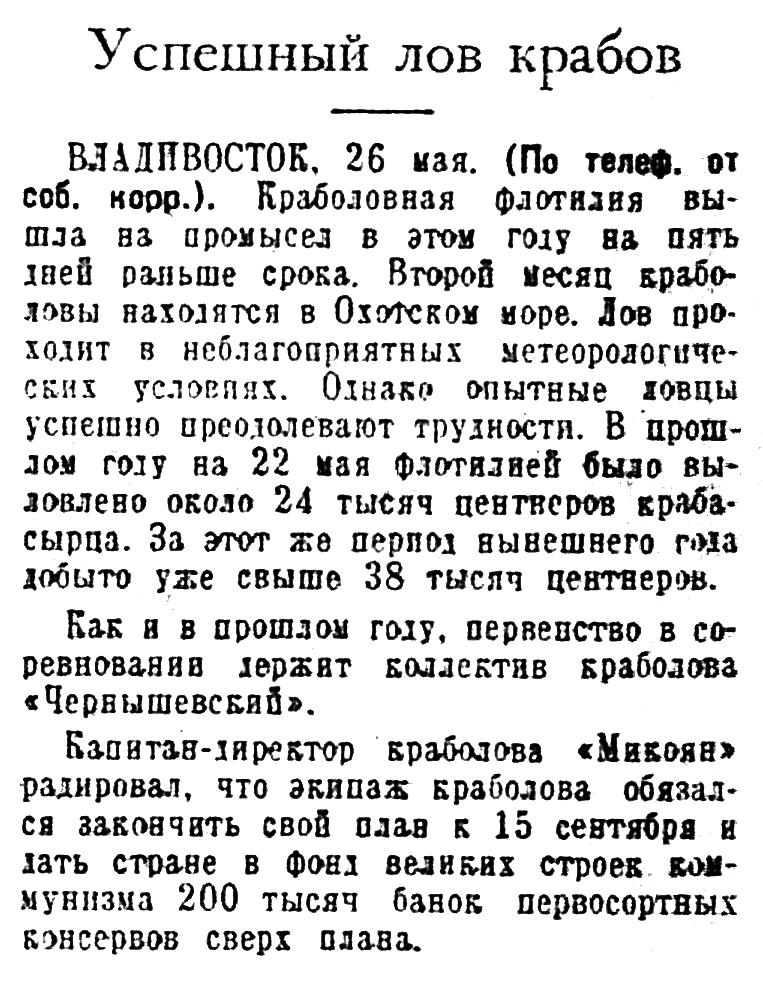 Капитан-директор краболова «Микоян» радировал, что экипаж краболова обивался закончить свой план к 15 сентября и дать стране в фонд великих строек коммунизма 200 тысяч банок первосортных консервов сверх плана.
