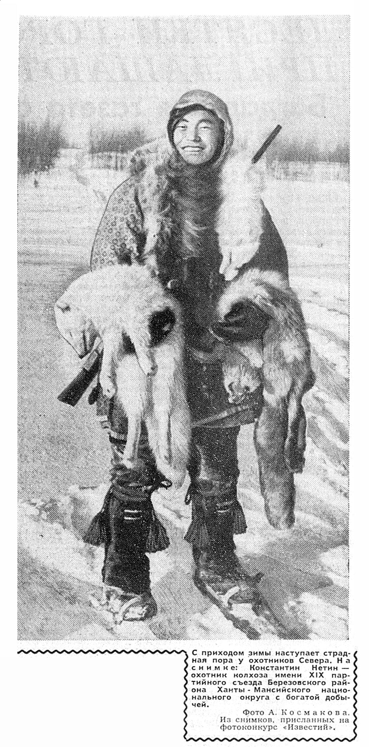 С приходом зимы наступает страдная пора у охотников Севера. На снимке: Константин Нетин — охотник колхоза имени XIX партийного съезда Березовского района Ханты - Мансийского национального округа с богатой добычей.