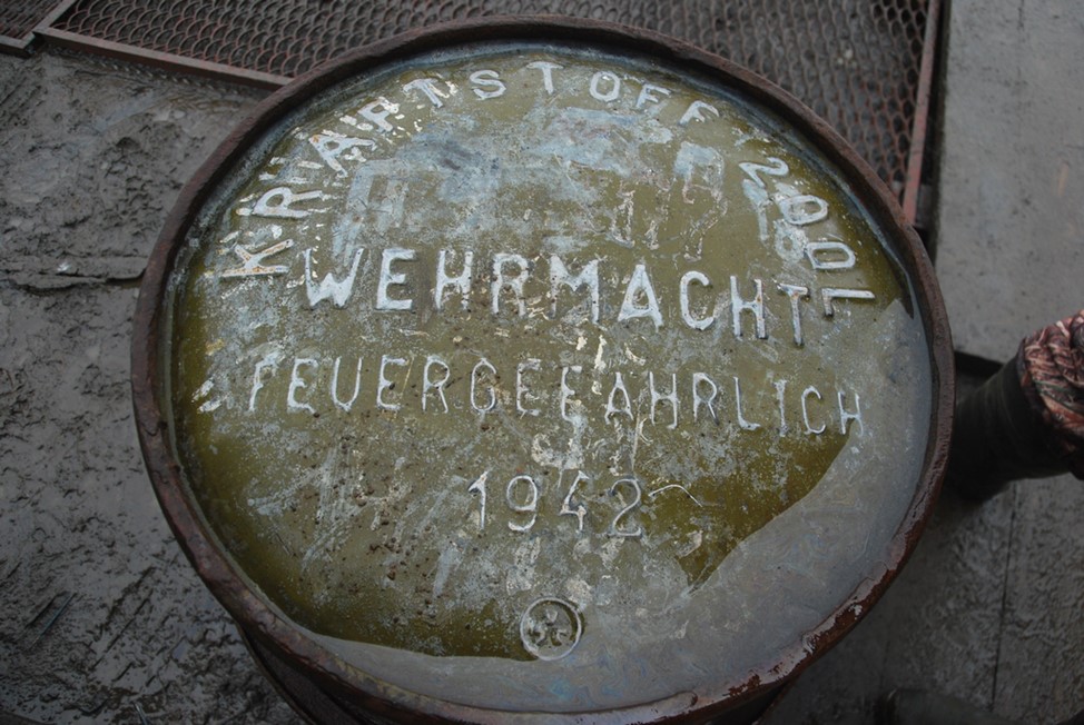 Вот только некоторые экспонаты, найденные при последних изысканиях: прицел дульного гранатомёта Schiessbecher, транспортная капсула авиационная (контейнер), плащ-палатка немецкая Zeltbahn образца 1931 года, корпус мины-лягушки Springminen, ботинок немецкий военно-морской Schnurschuhe, банка консервов «Португальские сардины». Книга H.J. Kitzing «Vergingen in Paris» Berlin, 1941. И многое другое. Вообще, к моменту начала работ национального парка, на Земле Александры ещё находилось много разных предметов, оставшихся от войны.Найденная бочка из-под топлива Вермахта, август 2012 года.