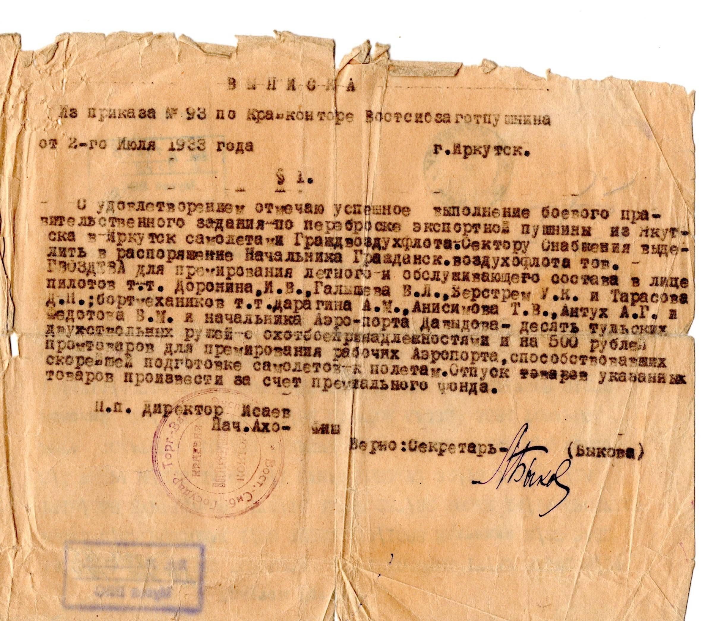 Диплом пилота-авиатора №753 от 16 июня 1918 г., выданный Всероссийским Авиационно-Воздухоплавательным обществом, Всероссийским Аэроклубом, представителем Международной Воздухоплавательной Федерации