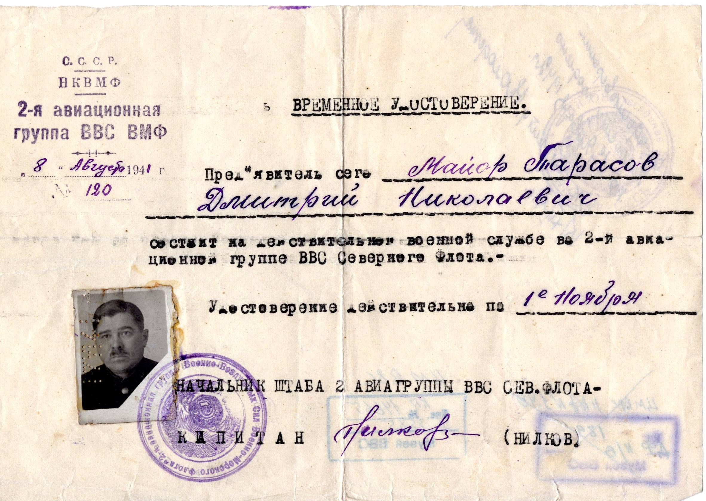 Удостоверение личности нш 16-го ато ВВС БВФ майораТарасова Д.Н. 1945 г.