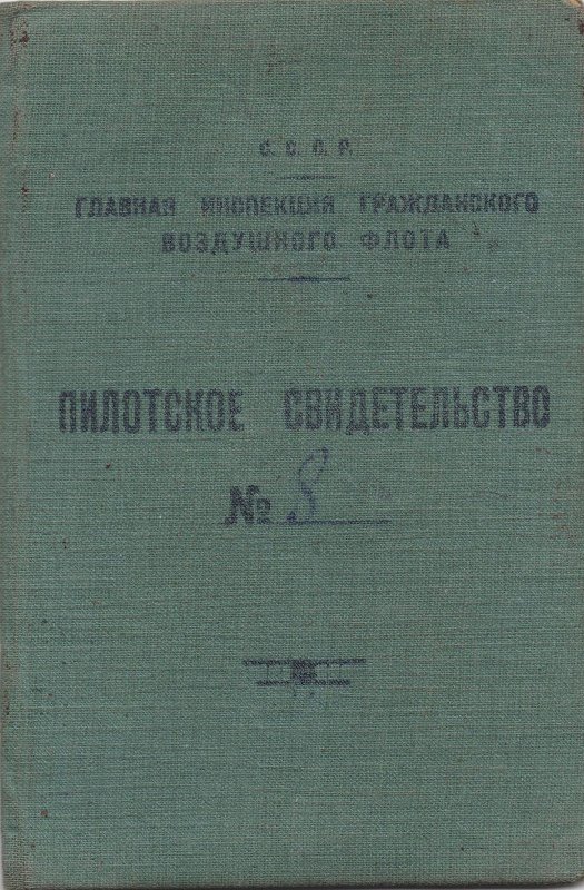 Пилотское свидетельство №8 от 9 апреля 1930 г., выданное Главной Инспекцией Гражданского Воздушного Флота.