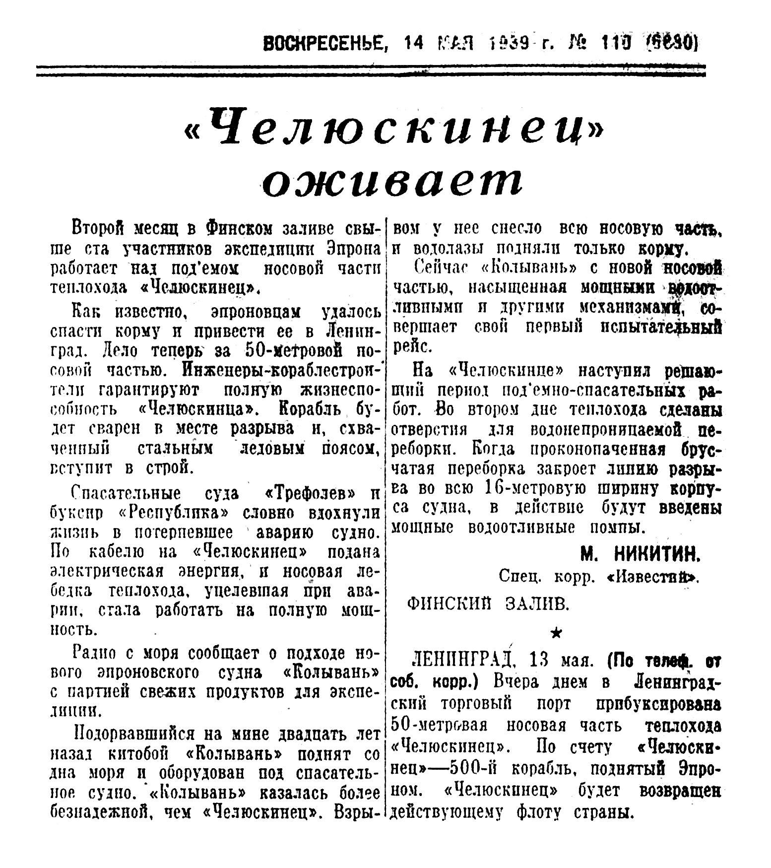 Известия, 1939, № 110 (6880), 14 мая.