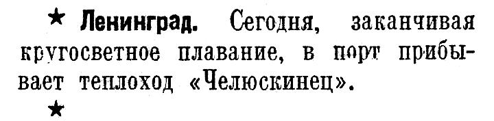 Одесса. Теплоход «Челюскинец», заканчивающий кругосветный рейс протяжением около 30 тыс. миль. 30 ноября прибыл в Ливерпуль. После захода в Лондон и Гавр теплоход направится в Ленинград.