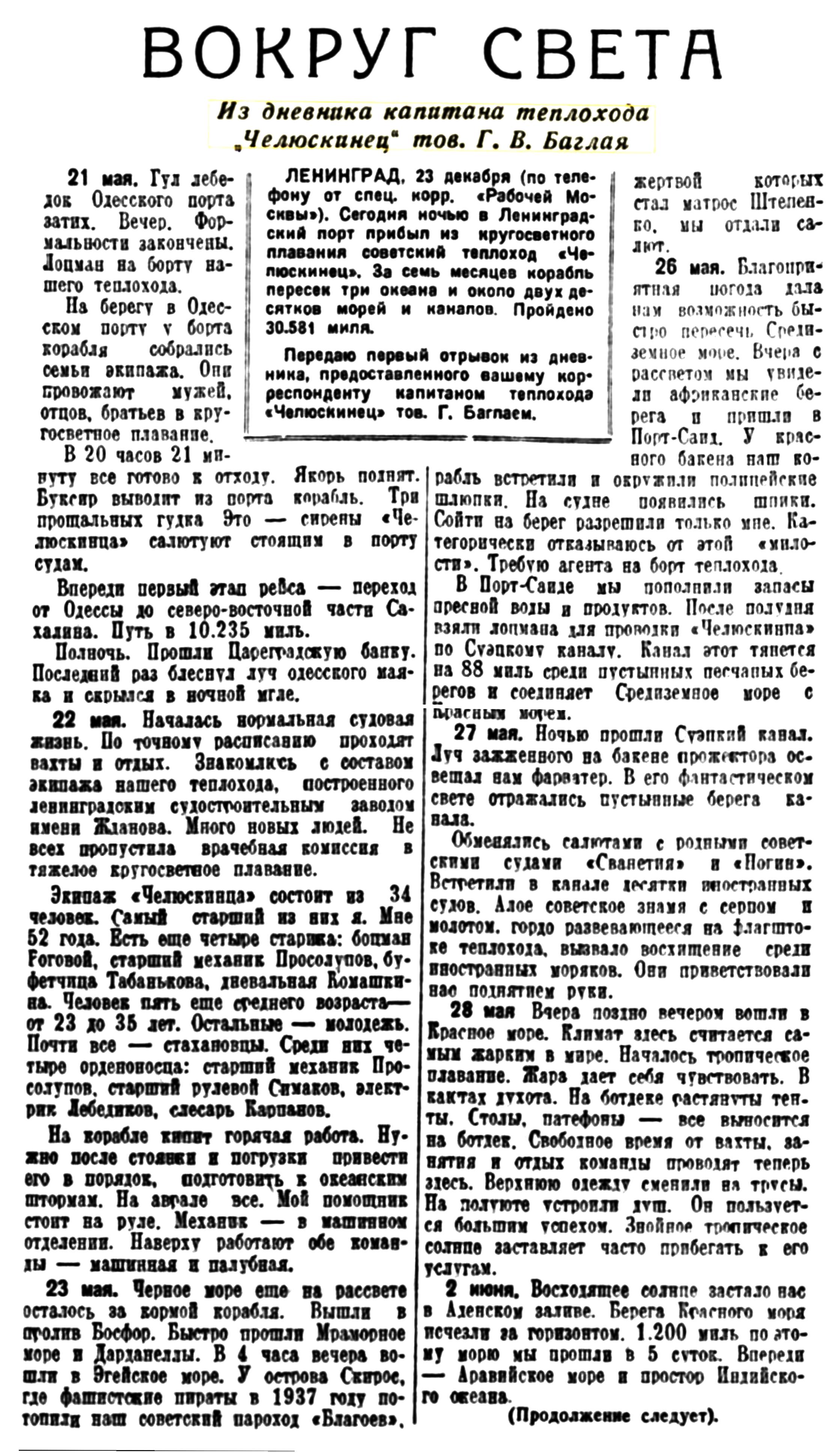 КРУГОСВЕТНЫЙ РЕЙС ТЕПЛОХОДА «ЧЕЛЮСКИНЕЦ»