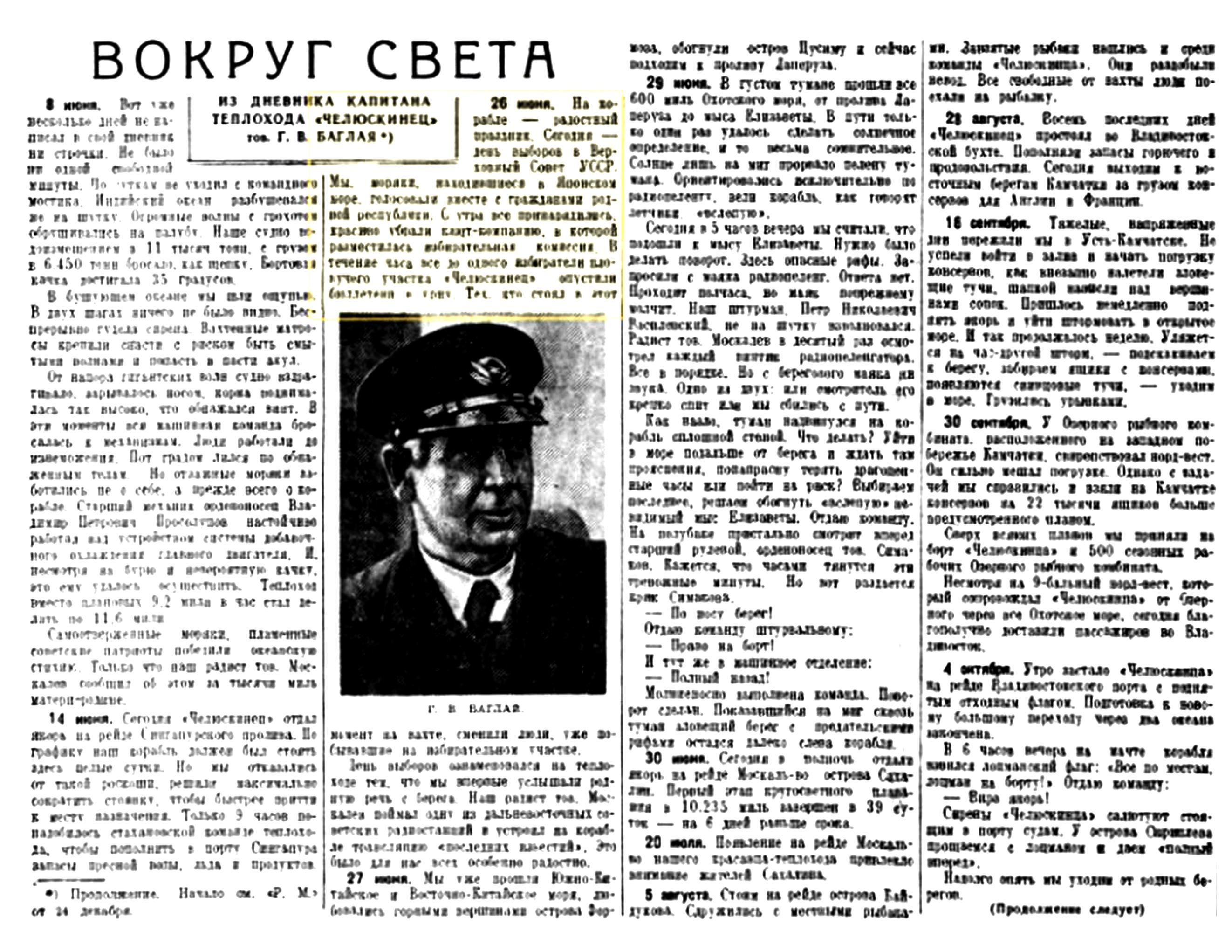 «Кругосветное плавание заканчивается успешно. Судно прошло уже около 80 тысяч миль. Пересекло два океана — Тихий и Атлантический. Команда чувствует себя прекрасно. Готовы пойти в новый ответственный рейс».