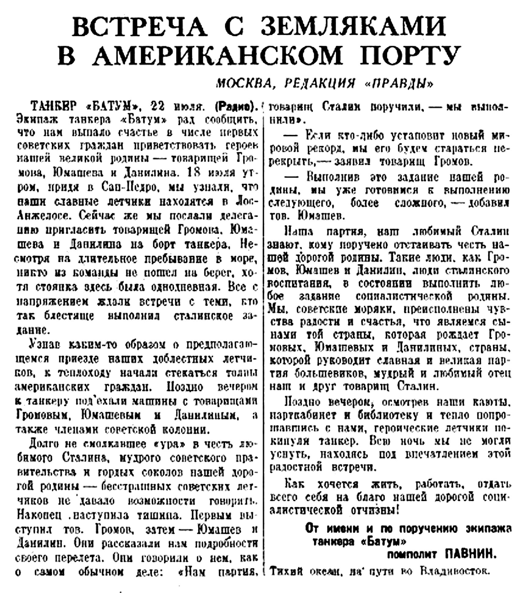 ТАНКЕР «БАТУМ», 22 июля. (Радио). Экипаж танкера «Батум» рад сообщить, что нам выпало счастье в числе первых советских граждан приветствовать героев нашей великой родины — товарищей Громова, Юмашева и Данилина. 18 июля утром, придя в Сан-Педро, мы узнали, что наши славные летчики находятся в Лос-Анжелосе. Сейчас же мы послали делегацию пригласить товарищей Громов. Юмашева и Данилина на борт танкера. Несмотря на длительное пребывание в море, никто из команды не пошел на берег, хотя стоянка здесь была однодневная. Все с напряжением ждали встречи с теми, кто так блестяще выполнил сталинское задание.