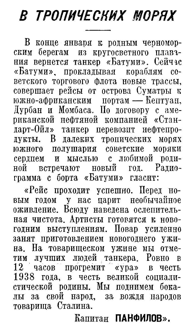 В конце января к родным черноморским берегам из кругосветного плавания вернется танкер «Батуми». Сейчас «Батуми», прокладывая кораблям советского торгового флота новые трассы, совершает рейсы от острова Суматры к южно-африканским портам — Кейптаун, Дурбан и Момбаса. По договору с американской нефтяной компанией «Стандарт-Ойл» танкер перевозит нефтепродукты. В далеких тропических морях южного полушария советские моряки сердцем и мыслью с любимой родиной встречают новый год. Радиограмма с борта «Батуми» гласит: «Рейс проходит успешно. Перед новым годом у нас царит необычайное оживление. Всюду наведена ослепительная чистота. Артисты готовятся к новогодним выступлениям. Повар усиленно занят приготовлением новогоднего ужина. На товарищеском ужине мы отметим лучших людей танкера. Ровно в 12 часов прогремит «ура» в честь 1938 года, в честь великой социалистической родины. Мы поднимем бокалы за свой народ, за вождя народов товарища Сталина.
