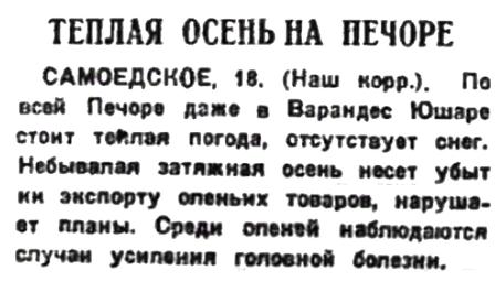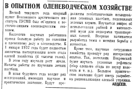 • Краевой конторе Заготскот, организациям области Коми и Ненецкого округа, тесно связанным в работе с тундровым населением, надо учесть этот первый важный опыт. Надо теперь же начать подготовительную работу с тем, чтобы с осени этого года начать массовый перегон оленьих стад для забоя в Архангельске.
