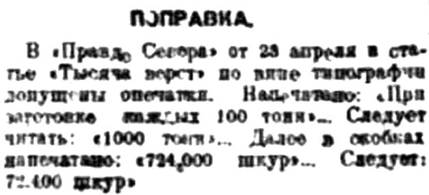 Правда Севера, 1933, № 98, 28 апреляПОПРАВКА.В «Правде Севера» от 23 апреля в статье "Тысяча верст" по вине типографии допущены опечатки. Напечатано "При заготовке каждых 100 тонн"... Следует читать: "1000 тонн"... Далее в скобках напечатано: "724, 000 шкур"... Следует: 72, 400 шкур"