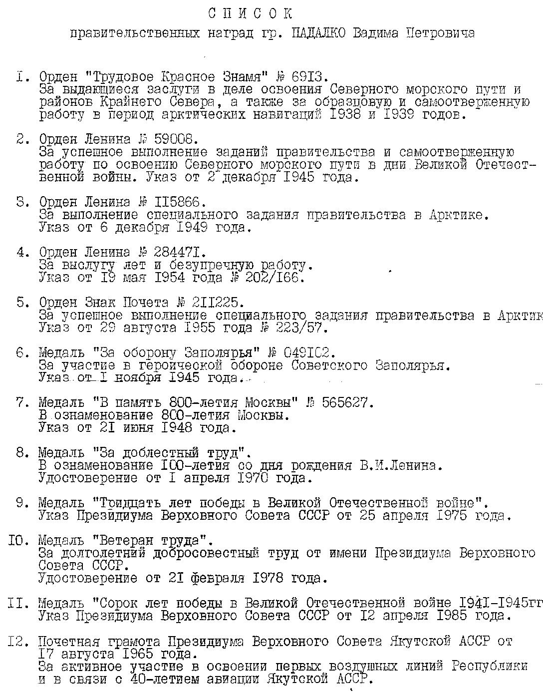 Прикладываю список наград Падалко В.П.