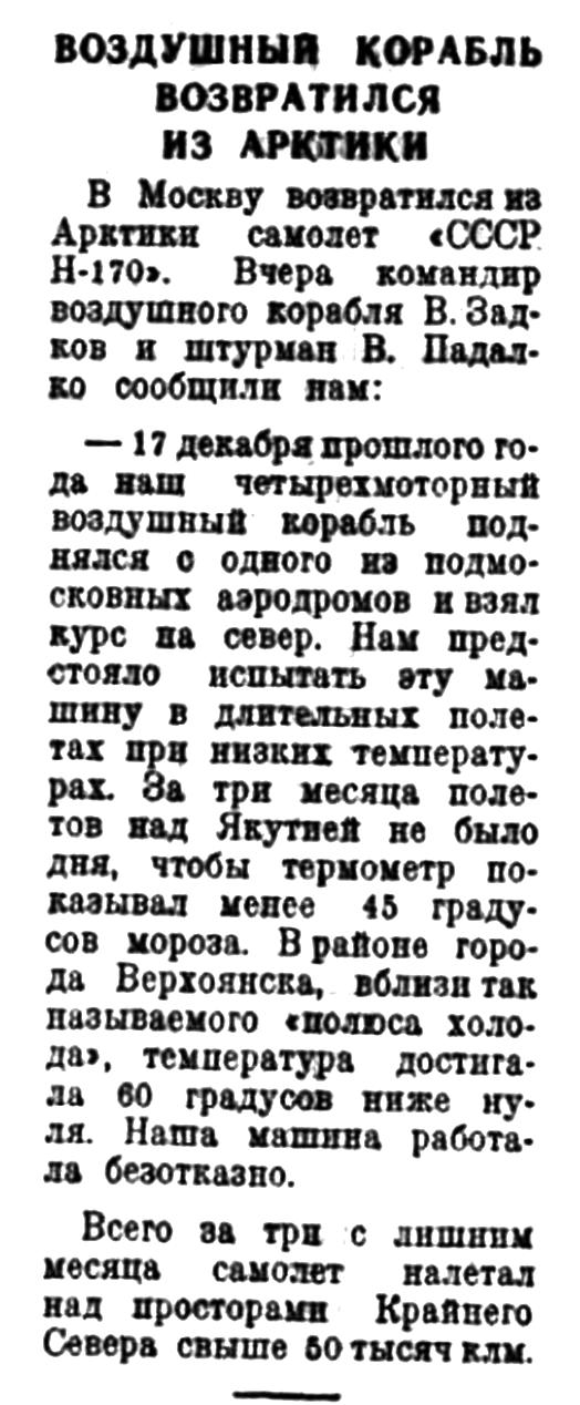 В Москву возвратился из Арктики самолет «СССР Н-170». Вчера командир воздушного корабля В. Задков и штурман В. Падалко сообщили нам: