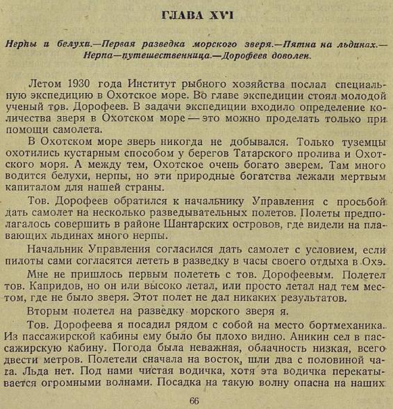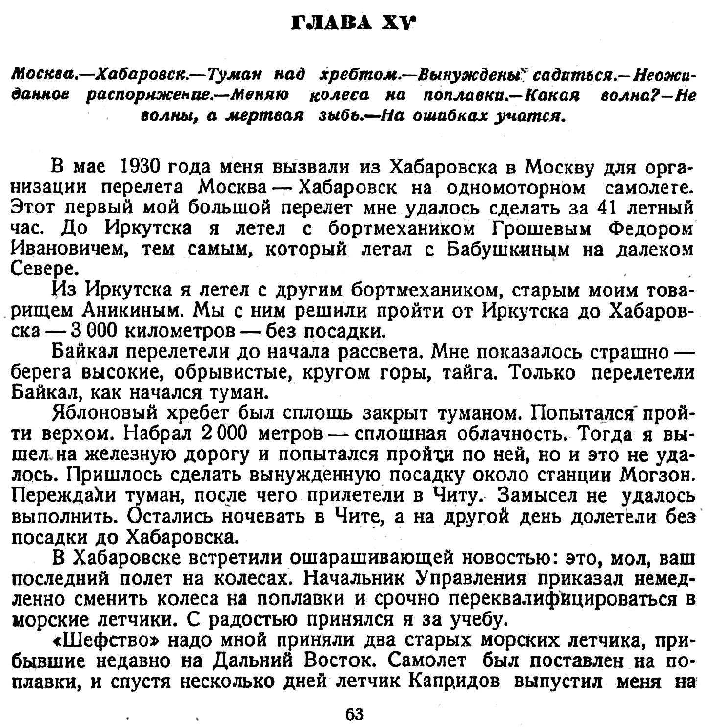 Сегодня ночью с Московского Центрального Аэродрома им. Фрунзе прямым рейсам в Хабаровск вылетает большой пасажирский самолет Добролета В—33. Аппарат идет под управлением летчика т. Водопьянова при бортмеханике т. Грошеве и имеет на борту двух пассажиров (до Новосибирска).
