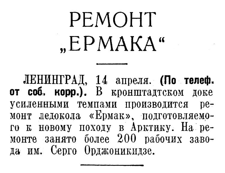 Ледокол «Ермак», готовящийся к рейсу на Землю Франца-Иосифа, бункеруется в Ленинградском порту. Выход ледокола в море намечается на 9—10 мая. В пути «Ермак» зайдет в Мурманск, где пополнит запасы угля и продовольствия. Закончив погрузку, ледокол немедленно выйдет в море Баренца и дальше к Земле Франца-Иосифа. Ведет ледокол «Ермак» капитан дальнего плавания тов. Сорокин.