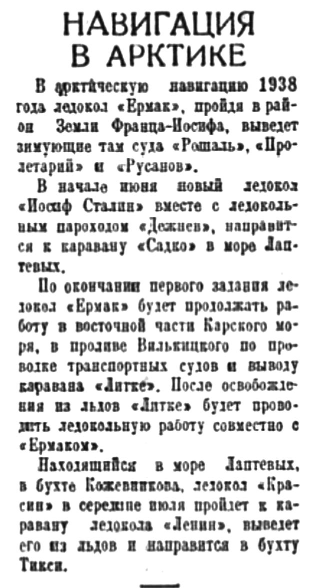 В арктическую навигацию 1938 года ледокол «Ермак», пройдя в район Земли Франца-Иосифа, выведет зимующие там суда «Рошаль», «Пролетарий» и «Русанов».