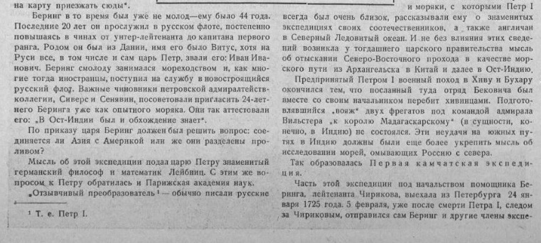 Одной из главных задач этой экспедиции, согласно ин­ струкции, написанной самим Петром, было решение вопроса, соединяется ли Америка с Азией и, таким обра­ зом, выяснение возможности достижения Китая и Индии через Северный Ледовитый океан.