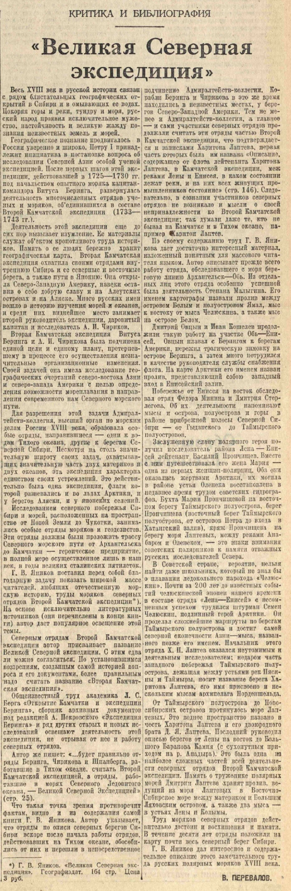 Перевалов В.Великая Северная экспедиция //Красный флот, 26 мая, 1950, № 124 (3537)