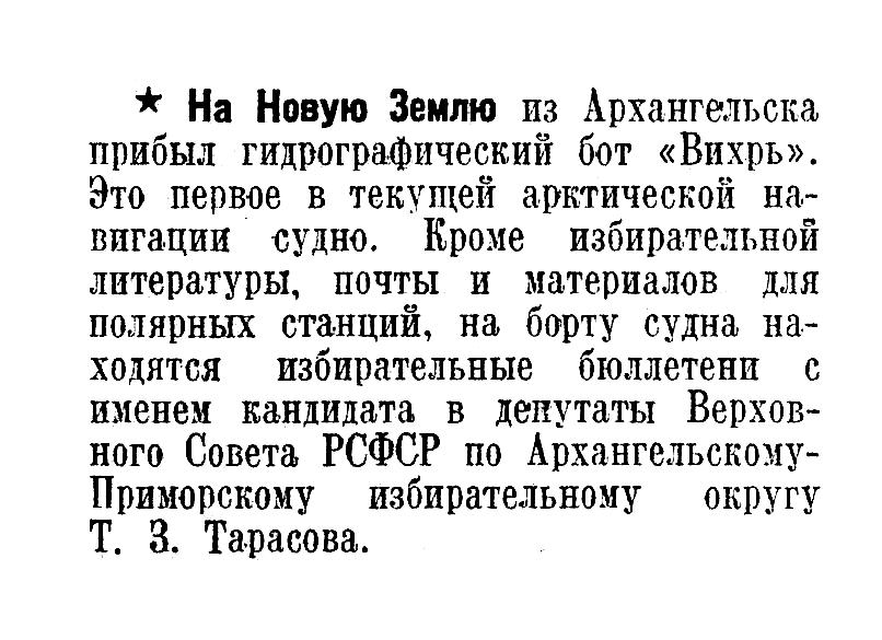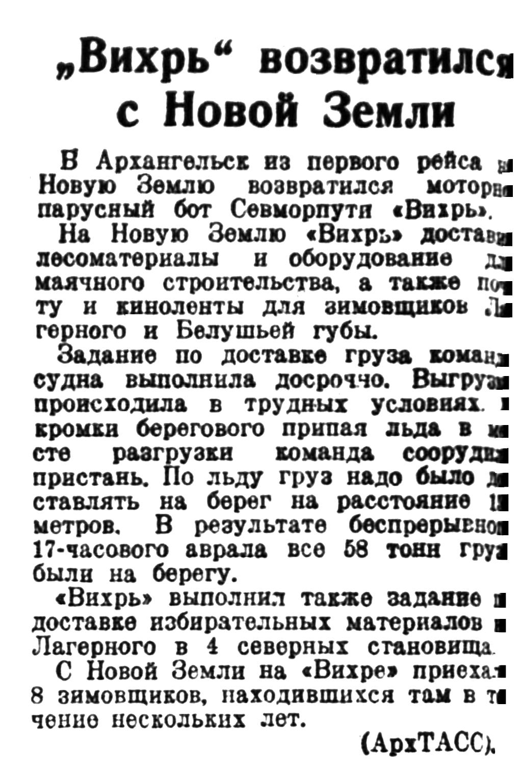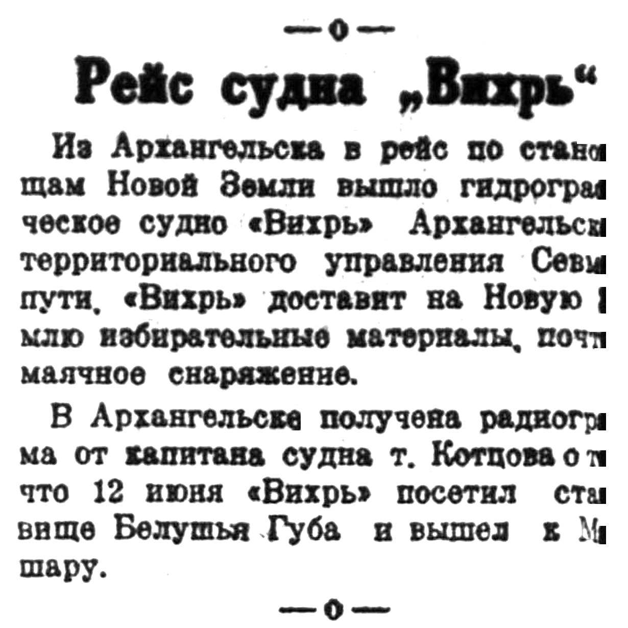 Гидрографическое управление Главсевморпути направило в 1940 г. гидрографическое судно «Вихрь» из Архангельска в бухту Провидения. Оно предназначалось для гидрографических работ в районе Анадырь — Колыма. «Вихрь» должен был в одну навигацию пройти весь Северный морской путь, причем большую часть его не в караване, а самостоятельно.
